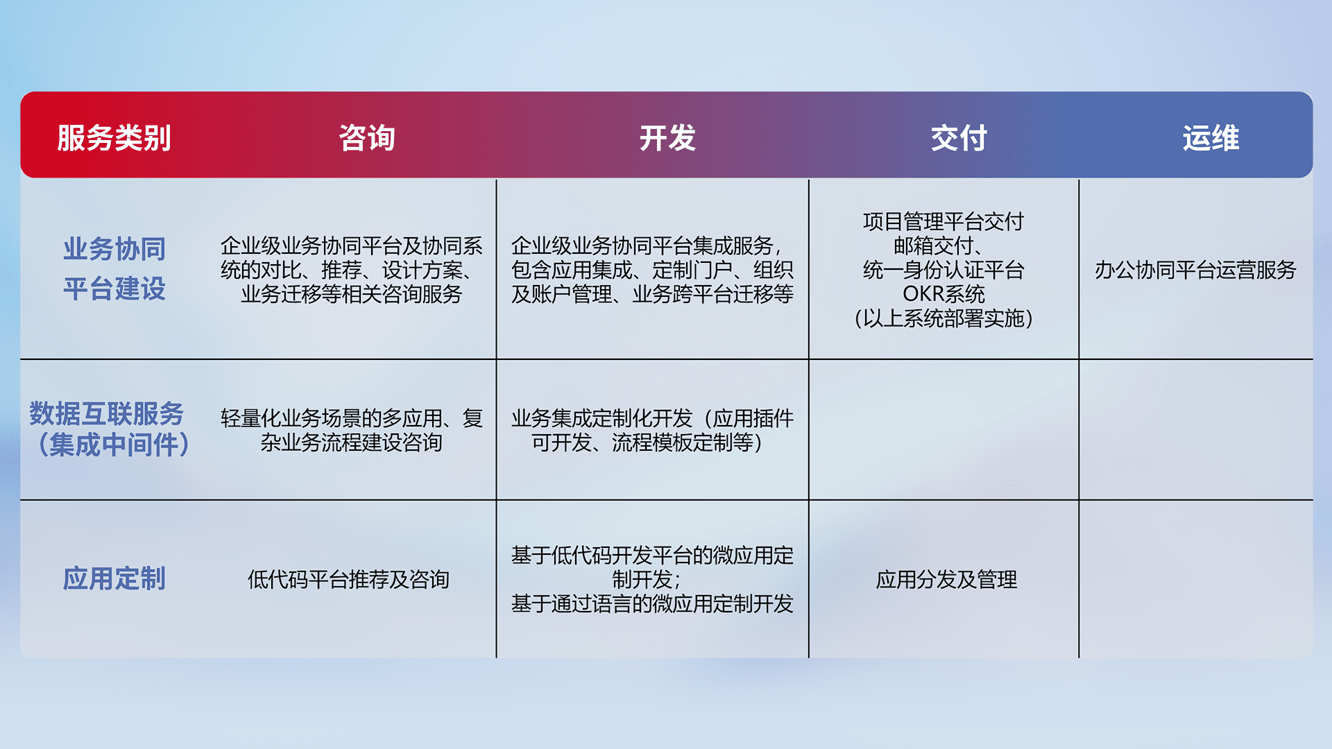 针对钉钉、、、、企微、、、、IDaas等平台级产品提供产品的规划、、、、方案、、交付、、、、定制化开发等服务,,,实现如统一协同办公、、、、智能客户服务、、、混合会议管理、、、智能数据查询、、等业务场景,,,,实现数字化转型。。